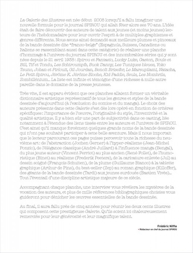 Avec 200 auteurs de BD et 400 pages, cet ouvrage rend hommage à l'univers de Spirou et aux héros célèbres nés dans le Journal de Spirou, de Gaston Lagaffe aux Schtroumpfs en passant par Lucky Luke. Cet ouvrage constitue un véritable florilège des auteurs essentiels de la bande dessinée franco-belge. Chacun d'eux a exprimé en une planche l'émotion, l'amour, la surprise, le délice, la réflexion que leur ont apportés le plus célèbre groom de la bande dessinée, son journal et ses héros. Chacune des planches est accompagnée d'un entretien avec son auteur et de ses références bibliographiques. Un must pour les 75 ans de Spirou et un phare pour tout lecteur de BD.