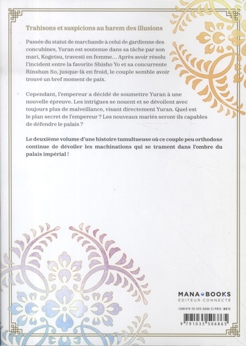 Trahisons et suspicions au harem des illusions Passée du statut de marchande à celui de gardienne des concubines, Yuran est soutenue dans sa tâche par son mari, Kogetsu, travesti en femme... Après avoir résolu l'incident entre la favorite Shisho Yo et sa concurrente Rinshun So, jusque-là en froid, le couple semble avoir trouvé un bref moment de paix. Cependant, l'empereur a décidé de soumettre Yuran à une nouvelle épreuve. Les intrigues se nouent et se dévoilent avec toujours plus de malveillance, visant directement Yuran. Quel est le plan secret de l'empereur ? Les nouveaux mariés seront-ils capables de défendre le palais ? Le deuxième volume d'une histoire tumultueuse où ce couple peu orthodoxe continue de dévoiler les machinations qui se trament dans l'ombre du palais impérial !