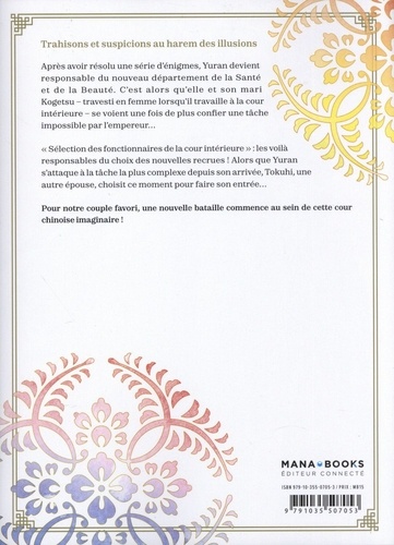 Après avoir résolu une série d'énigmes, Yuran devient responsable du nouveau département de la Santé et de la Beauté. C'est alors qu'elle et son mari Kogetsu - travesti en femme lorsqu'il travaille à la cour intérieure - se voient une fois de plus confier une tâche impossible par l'empereur... "Sélection des fonctionnaires de la cour intérieure" : les voilà responsables du choix des nouvelles recrues ! Alors que Yuran s'attaque à la tâche la plus complexe depuis son arrivée, Tokuhi, une autre épouse, choisit ce moment pour faire son entrée... Pour notre couple favori, une nouvelle bataille commence au sein de cette cour chinoise imaginaire !