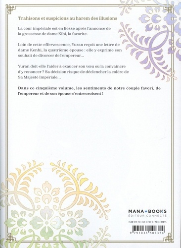 Trahisons et suspicions au harem des illusions ! La cour impériale est en liesse après l'annonce de la grossesse de dame Kihi, la favorite. Loin de cette effervescence, Yuran reçoit une lettre de dame Kenhi, la quatrième épouse : elle y exprime son souhait de divorcer de l'empereur... Yuran doit-elle l'aider à exaucer son voeu ou la convaincre d'y renoncer ? Sa décision risque de déclencher la colère de Sa Majesté Impériale... Dans ce cinquième volume, les sentiments de notre couple favori, de l'empereur et de son épouse s'entrecroisent !