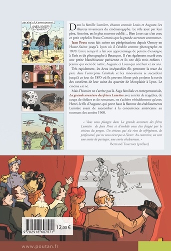 Dans la famille Lumière, chacun connaît Louis et Auguste, les illustres inventeurs du cinématogaphe. Le rôle joué par leur père, Antoine, est le plus souvent oublié... Bien à tort car c'est avec ce petit orphelin Franc-Comtois que la grande aventure commence. Jean Prost nous fait suivre ses pérégrinations depuis Ormoy en Haute-Saône jusqu'à Lyon où il s'établit comme photographe en 1870. Entre temps il a fait son apprentissage de peintre d'enseigne à Paris et de photographe à Besançon. Il s'est également marié avec une petite blanchisseuse parisienne et ils ont déjà trois enfants : Jeanne qui vient de naître, Auguste et Louis qui ont huit et six ans. Très rapidement, les deux inséparables fils prennent la trace du père dans l'entreprise familiale et les innovations se succèdent jusqu'à ce jour de 1895 où ils peuvent filmer puis projeter la sortie des ouvrières de leur usine du quartier de Monplaisir à Lyon. Le cinéma est né. Mais l'histoire ne s'arrête pas là. Saga familiale et entrepreneuriale, La grande aventure des frères Lumière avec son lot de tragédies, de coups de théâtre et de romances, ne s'achève véritablement qu'avec Henri, le fils d'Auguste, qui porte haut la flamme des établissements Lumière avant de succomber à la concurrence américaine au tournant des années 1960.