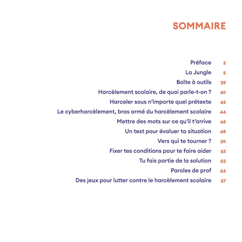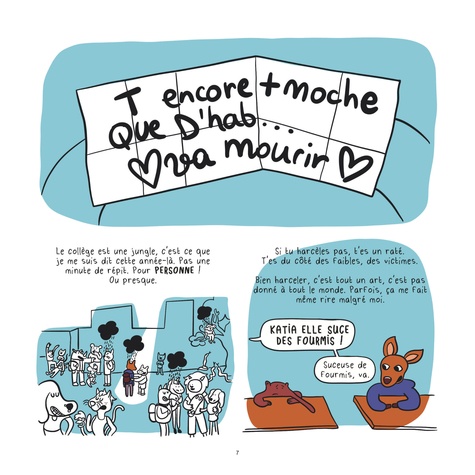 Manon entre au collège. Et cette année, elle est déterminée : tout va être parfait. Mais c'est sans compter sur Stacey et sa bande qui vont progressivement faire basculer le quotidien de Manon dans la jungle du harcèlement scolaire. Cette BD raconte comment, accompagnée de ses parents, d'enseignants et de professionnels, elle est sortie de l'enfer. A la fin de cette histoire, tu trouveras un dossier proposant des solutions pour lutter ensemble contre "le fléau du préau".