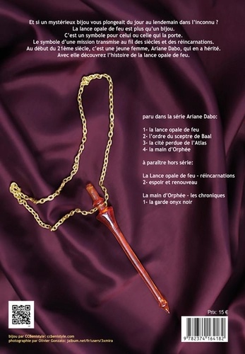 Et si un mystérieux bijou vous plongeait du jour au lendemain dans l'inconnu ? La Lance opale de feu est plus qu'un bijou. C'est un symbole pour celui ou celle qui la porte. Le symbole d'une mission transmise au fil des siècles et des réincarnations. Au début du 21è siècle, c'est une jeune femme, Ariane Dabo, qui en a hérité. Avec elle découvrez l'histoire de la lance opale de feu.