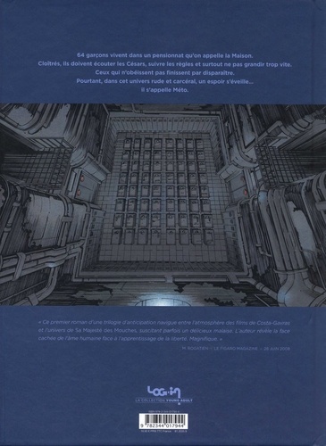 "64 garçons vivent dans une grande maison coupée du monde. Je suis l'un d'eux" Ils sont 64 enfants, coupés du monde et surveillés de main de fer par les Césars. Le quotidien de Méto, Quintus et leurs camarades est régulé par des règles étranges et rigides. Aucun écart de conduite n'est toléré. Seule manière de survivre à ce quotidien : respecter le code de conduite, encore et encore. Lorsque Méto se voit confier la responsabilité de former le nouvel arrivant Crassus, il sait qu'il va devoir mettre les bouchées doubles pour ne pas être sanctionné. Tandis qu'il lui enseigne les règles de la maison, Méto débute une quête de la vérité : pourquoi personne n'a de souvenirs d'avant leur arrivée ? Pourquoi sont-ils ici ? Et surtout, qu'il y a-t-il à l'extérieur ? Lylian et le dessinateur Nesmo retranscrivent avec brio l'ambiance mystérieuse et claustrophobique de l'oeuvre d'Yves Grevet. Ce huis clos nous plonge dans les tourments d'adolescents livrés à eux-mêmes, qui doivent faire face à des épreuves aussi bien physiques que mentales face à l'inconnu et l'obscurantisme. Le premier tome d'une série qui s'annonce incontournable. La trilogie culte d'Yves Grevet est éditée chez Syros, traduite en 8 langues et récompensée par 13 prix littéraires.