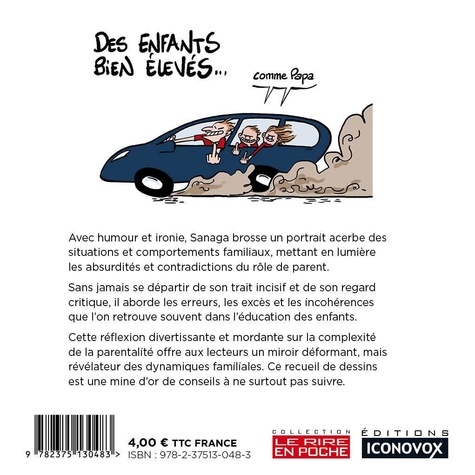 Avec humour et ironie, Sanaga brosse un portrait acerbe des situations et comportements familiaux, mettant en lumière les absurdités et contradictions du rôle de parent. Sans jamais se départir de son trait incisif et de son regard critique, il aborde les erreurs, les excès et les incohérences que l'on retrouve souvent dans l'éducation des enfants. Cette réflexion divertissante et mordante sur la complexité de la parentalité offre aux lecteurs un miroir déformant, mais révélateur des dynamiques familiales. Ce recueil de dessins est une mine d'or de conseils à ne surtout pas suivre.