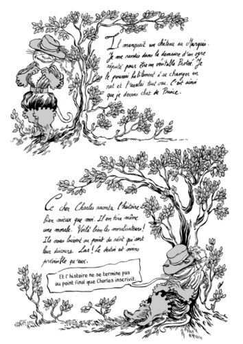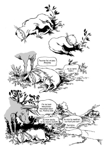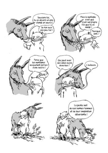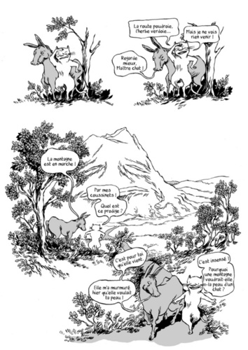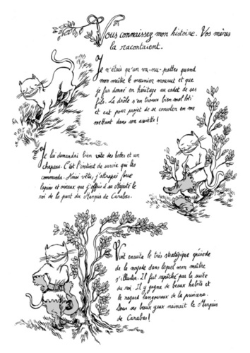 Le chat botté commence par présenter son histoire, de la création du marquis de Carabas à la lutte tactique contre l'ogre changé en rat. Il nous rappelle que les moralistes stoppent le récit au point qui les sert mais que l'histoire ne s'arrête pas au point final que Charles Perrault écrivit. Le maître chat apprend au début de notre histoire, alors qu'il goûte un repos bien mérité, qu'une montagne est en marche et qu'elle marche sur lui. La raison en est absurde : le chat a croqué un ogre changé en souris et la montagne a cru qu'il s'agissait de son propre fils. En effet ne dit-on pas que les montagnes accouchent parfois d'une souris ? Pour se tirer de ce mauvais pas, le maître chat décide de faire une alliance avec le peuple souriquois, afin de trouver une souris de rechange pour flouer la montagne. Les souris lui pré-sentent leur meilleur élément, Patience, la souris qui a vaincu le lion de la fable ! Dans le même temps, craignant un coup fourré du maître chat, elles envoient un messager porter une lettre à l'auteure, pour s'assurer de la véracité de toute cette histoire. Le messager doit gagner les dernières pages du livre, susceptibles de porter l'adresse de l'auteure...