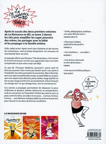 Enfin, bébé arrive ! Après neuf mois d'attente et des heures de contractions, voici la phase d'expulsion. Un nouveau-né sera bientôt dans vos bras. Ce passage ultime vous fait peur ? Pas de panique, c'est normal. Et ce livre est là, pour ne rien vous apprendre mais vous faire comprendre ce que votre corps sait déjà. Ici, pas de "Poussez, Madame, poussez ! " , parce qu'il ne faut pas pousser. Vous n'avez pas besoin qu'on vous parle à l'impératif, vous êtes puissante et souveraine. Bien informée, que vous ayez une péridurale ou pas, un petit bébé ou un gros, que vous soyez noire, blanche, jaune, dorée, rouge (parfois on est un peu rouge à la fin d'un accouchement, il faut l'avouer) ne change rien. Ce qui change tout, c'est la connaissance ! De la dilatation complète à la sortie du bébé, du premier cri à la délivrance du placenta... cette BD vous dévoile, en dessin et avec humour, la connaissance élémentaire de votre corps, de vos émotions et du processus de la naissance. Ces secrets à propager permettent de dépasser la peur, d'affronter la douleur, d'éviter déchirures et complications, et de se concentrer sur l'essentiel : l'enfant qui vient à vous, sa peau contre la vôtre, son odeur et ses yeux... L'amour, l'amour, l'amour... seul élément indispensable (la science le prouve), pour donner la vie dans de bonnes conditions.