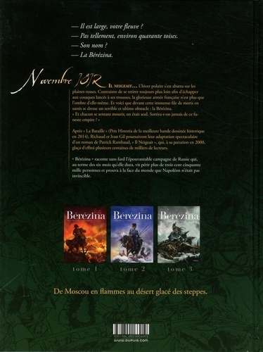 Novembre 1812. Il neigeait... L'hiver polaire s'est abattu sur les plaines russes. Contrainte de se retirer toujours plus loin afin d'échapper aux cosaques lancés à ses trousses, la glorieuse armée française n'est plus que l'ombre d'elle-même. Et voici que devant cette immense file de morts en sursis se dresse un terrible et ultime obstacle : la Bérézina. "Et chacun se sentant mourir, on était seul. Sortira-t-on jamais de ce funeste empire ?" Après "La Bataille" (Prix Historia de la meilleure bande dessinée historique en 2014), Richaud et Ivan Gil poursuivent leur adaptation spectaculaire d'un roman de Patrick Rambaud, "Il Neigeait", qui, à sa parution en 2000, glaça d'effroi plusieurs centaines de milliers de lecteurs. "Bérézina" raconte sans fard l'épouvantable campagne de Russie qui, au terme des six mois qu'elle dura, vit périr plus de trois cent cinquante mille personnes et prouva à la face du monde que Napoléon n'était pas invincible.