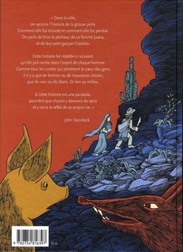 "Dans la ville, on raconte l'histoire de la grosse perle. Comment elle fut trouvée et comment elle fut perdue„ On parle de Kino le pêcheur, de sa femme Juana, et de leur petit garçon Coyotito. Cette histoire fut répétée si souvent, qu'elle prit racine dans l'esprit de chaque homme. Comme tous les contes qui pénètrent le coeur des gens, il n'y a que de bonnes ou de mauvaises choses, que du noir ou du blanc. Et rien au milieu. Si cette histoire est une parabole, peut-être que chacun y donnera du sens et y verra le reflet de sa propre vie." John Steinbeck