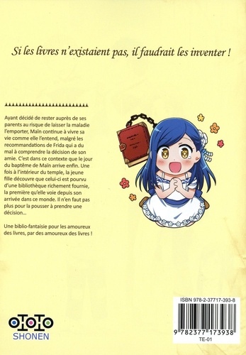 Si ces livres n'existaient pas, il faudrait les inventer ! Ayant décidé de rester auprès de ses parents au risque de laisser la maladie l'emporter, Maïn continue à vivre sa vie comme elle l'entend, malgré les recommandations de Frida qui a du mal à comprendre la décision de son amie. C'est dans ce contexte que le jour du baptême de Maïn arrive enfin. Une fois à l'intérieur du temple, la jeune fille découvre que celui-ci est pourvu d'une bibliothèque richement fournie, la première qu'elle voie depuis son arrivée dans ce monde. Il n'en faut pas plus pour la pousser à prendre une décision... Une biblio-fantaisie pour les amoureux des livres, par des amoureux des livres !