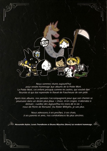 Nous sommes réunis aujourd'hui pour rendre hommage aux albums de la Petite Mort. La Petite Mort, cet enfant presque comme les autres, qui voulait être fleuriste et qui dut reprendre le travail de Faucheuse de son père. Après trois albums, nos pensées l'accompagnent pour que son chemin se poursuive dans un destin plus doux. "Vivez, m'en croyez, n'attendez à demain ; cueillez dès aujourd'hui les roses de la vie." nous dit Pierre de Ronsard. Ou Robin Williams, je sais plus. Nous adressons à ses proches, à ses chats, à ses parents et amis, nos condoléances les plus sincères.