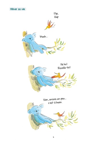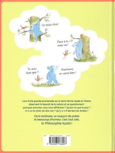 Lors d'une grande promenade sur la terre ferme, Koala et Oiseau observent la beauté de la nature et se questionnent : pourquoi sommes-nous tous différents ? Qu'est-ce que la peur ? A-t-on le choix de dire non ? Qu'y a-t-il derrière les étoiles ? De la tendresse, un soupçon de poésie et beaucoup d'humour, c'est tout cela, la Philosophie Koala !