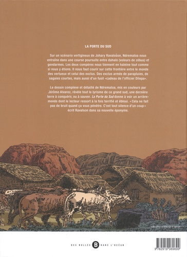 Sur un scénario vertigineux de Johary Ravalson, Ndrematoa nous entraine dans une course poursuite entre dahalo (voleurs de zébus) et gendarmes. Les deux compères nous tiennent en haleine tout comme si nous y étions. Il nous faut courir sur cette frontière entre le monde des vertueux et celui des exclus. Des exclus armés de parapluies, de sagaies courtes, mais aussi d'un fusil, cadeau de l'officier de Dilepa. Le dessin complexe et détailé de Ndrematoa, mis en couleur par Jérôme Alvarez, révèle tout le lyrisme de ce grand sud, une dernière terre à conquérir, ou à sauver. La porte du sud donne à voir un arrière-monde dont le lecteur ressort à la fois terrifié et ébloui. Cela ne fait pas de bruit quand cela vous pénètre. C'est tout silence d'un coup comme l'écrit Johary Ravaloson dans sa nouvelle éponyme.