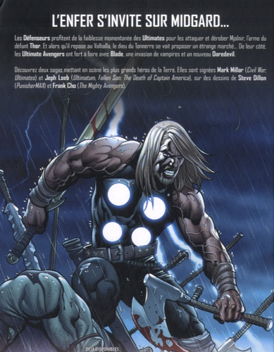 Les Défenseurs profitent de la faiblesse momentanée des Ultimates pour les attaquer et dérober Mjolnir, l'arme du défunt Thor. Et alors qu'il repose au Valhalla, le dieu du Tonnerre se voit proposer un étrange marché... De leur côté, les Ultimate Avengers ont fort à faire avec Blade, une invasion de vampires et un nouveau Daredevil. Découvrez deux sagas mettant en scène les plus grands héros de la Terre. Elles sont signées Mark Millar (Civil War, Ultimates) et Jeph Loeb (Ultimatum, Fallen Son : The Death of Captain America), sur des dessins de Steve Dillon (PunisherMAX) et Frank Cho (The Mighty Avengers).