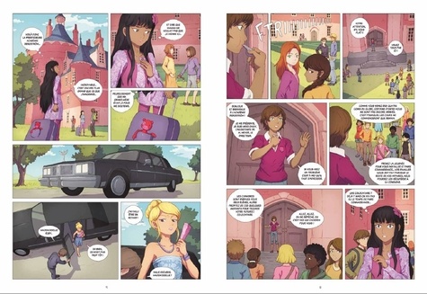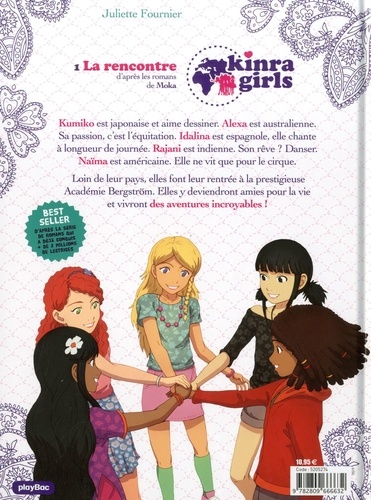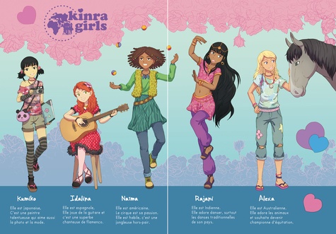 Dans le tome 1 Kumiko aime dessiner. Alexa est championne d'équitation. Rajani danse, Idalina chante, et Naïma est une artiste de cirque. Toutes sont issues des 4 coins du monde... Et toutes font leur entrée à l'Académie Internationale Bergström. Loin de chez elles, elles vont découvrir leurs différentes cultures, et devenir amies pour la vie... Mais ça n'est pas si simple de s'acclimater à une nouvelle vie, même quand on a une super bande de copines et des cours passionnants. Idalina peine à montrer ses talents au cours de chant. Rajani a une prof de danse à l'exigence qui ferait douter même les meilleures... Quant à Naïma, elle devrait se méfier de cette peste de Ruby et de sa bande. Heureusement qu'Alexa, l'australienne intrépide et pleine d'imagination, a décidé de partager avec elles son secret : un code secret qui leur permettra de se parler sans être comprises des autres. Ca y est, la bande des KINRA GIRLS est née ! Un tome d'exposition et la naissance d'une solide amitié autour de valeurs fortes et positives qui plairont au jeune public et à leurs parents ! Le petit plus : un très bel ex-libris constituant la première pièce d'une frise offert dans le tome 1.