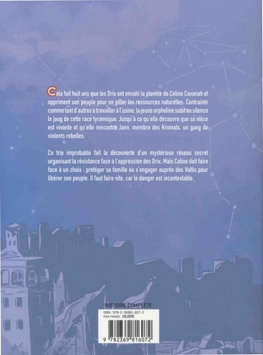Cela fait huit ans que les Drix ont envahi la planète de Coline Cavanah et oppriment son peuple pour en piller les ressources naturelles. Contrainte comme tant d'autres à travailler à l'usine, la jeune orpheline subit en silence le joug de cette race tyrannique. Jusqu'à ce qu'elle découvre que sa nièce est vivante et qu'elle rencontre Jann, membre des Kromats, un gang de violents rebelles. Ce trio improbable fait la découverte d'un mystérieux réseau secret organisant la résistance face à l'oppression des Drix. Mais Coline doit faire face à un choix : protéger sa famille ou s'engager auprès des Valtis pour libérer son peuple. Il faut faire vite, car le danger est incontestable.
