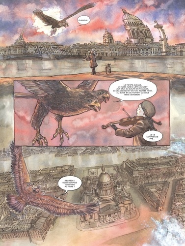 Evoquer l'horreur de la guerre à travers la douceur d'un conte. URSS, 1941. La vie d'Olenka bascule quand les troupes nazies envahissent l'Union soviétique et assiègent la ville de Leningrad. Lorsque la petite fille de huit ans perd ses parents et son frère, elle se réfugie dans son appartement abandonné. Désormais seule avec son chien, Olenka survit tant bien que mal à la faim et au gel, et s'évade en faisant vibrer les cordes de son violon. Elle rêve d'un aigle à deux têtes qui lui explique que la ville entière est sous le joug d'une malédiction. Seule la musique d'Olenka est capable de dissoudre le charme de glace qui a piégé la déesse de la vie, avec tous les habitants de Leningrad. Mais quel sera le prix à payer pour Olenka ?