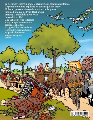 Martin est revenu dans son village du sud-ouest. Tout ce qu'il a vécu durant la Grande Guerre l'a bouleversé et il essaie de transmettre à ses trois enfants le souci de la paix. Mais tout le monde a trop confiance : en la Société des Nations censée garantir la paix, dans le traité de Versailles qui a humilié le vaincu sans l'empêcher de reconstruire son armée, dans la ligne Maginot, inadaptée aux nouvelles techniques de guerre... Martin voit avec désolation ses deux fils partir pour le front, comme lui auparavant. En 1942, la France est battue, occupée par les Allemands, le conflit s'étend sur toute la terre, l'espoir semble un mot perdu pour longtemps... Christian Goux, le dessinateur a connu Hergé, l'auteur du très célèbre Tintin et a même dirigé le journal Tintin en France. Il a dessiné de nombreuses BD humoristiques mais aussi historiques comme les Petites Histoires de l'Art racontées aux enfants. Guy Lehideux est un drôle de professeur : il est professeur de bandes dessinées ! Comme il aime beaucoup l'Histoire, il écrit de nombreux scénarios de BD sur de grands personnages historiques ou religieux. Il parle assez souvent à la radio de l'histoire de la bande dessinée. A partir de 9 ans. Des mêmes auteurs et dans la même collection Les Châteaux forts racontés aux enfants - BD La Grande Guerre racontée aux enfants - BD La Seconde Guerre Mondiale racontée aux enfants - Tome 1 - BD La Seconde Guerre mondiale racontée aux enfants - Tome 2 - BD Petites histoires de l'art racontées aux enfants - Tome 1 - BD Petites histoires de l'art racontée aux enfants - Tome 2 - BD Petites histoires de l'art racontée aux enfants - Tome 3 - BD