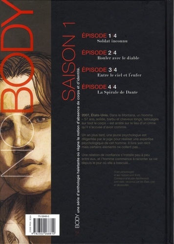 Le 4e et dernier épisode de NOBODY, une série d'anthologie où règne la notion d'absence de corps et d'identité... 2007, états-Unis. Dans le Montana, un homme 57 ans, solide, barbu et cheveux longs, tatouages sur tout le corps est arrêté sur le lieu d'un crime qu'il s'accuse d'avoir commis. Un an plus tard, une jeune psychologue Béatrice Brennan est diligentée par le juge pour réaliser une expertise psychologique de cet homme. Il livre son récit mais certains éléments ne collent pas... Dans cet ultime épisode, après avoir confondu Mme Perkins, l'homme se confronte à une nouvelle vie... et notamment, au handicap de sa femme et à l'inattendue réapparition d'une personne de son passé... Les pièces du puzzle s'emboîtent pour constituer, peu à peu, le tableau final. Souvent, la vérité est juste sous nos yeux, mais on ne la voit pas. Un final à couper le souffle. Si les personnages et leur histoire sont fictifs, Cointelpro et le plan Northwoods sont réels, reconnus par les états-Unis et déclassifiés.