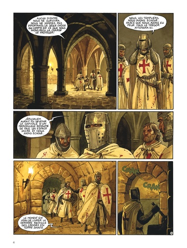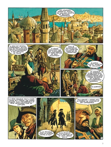L'histoire commence en 1291, en Terre sainte, alors que les Templiers s'apprêtent à livrer leur dernière bataille. Elle se poursuit à Istanbul, au XVIIIe siècle, où l'on retrouve le Scorpion en fâcheuse posture. Elle s'achève en Cappadoce, " pays où l'eau et le vent ont tracé leurs méandres ", sur la piste d'une croix qui suscite bien des convoitises. Et qui offre à celui qui la possède l'accès au fabuleux trésor des Templiers... A condition de ne pas rester prisonnier d'un sanctuaire creusé à flanc de falaise, comme ce pauvre Scorpion ! Le Scorpion se ferait-il moins fringant au fil de ses aventures ? Cette fois, il ne doit son salut qu'à la vénéneuse ? mais séduisante ? Méjaï, laquelle se sert de sa ruse pour le tirer des griffes de leurs tortionnaires. Et la fin de ce cinquième volume le laisse dans une situation quelque peu délicate... Le dessin de Marini, lui, n'a rien perdu de sa superbe, ni ses couleurs de leur flamboyance. Le scénario de Desberg, qui allie avec le même bonheur son goût pour la face cachée de l'Histoire et sa passion de l'action, balade le lecteur au coeur de l'empire Ottoman, sur les routes de la Cappadoce mystérieuse et sur les traces des Chevaliers du Temple...