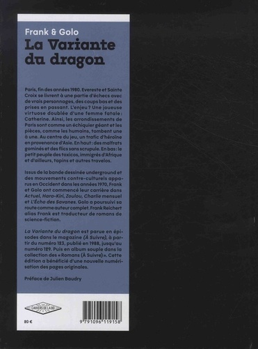 Paris, fin des années 1980. Evereste et Sainte Croix se livrent à une partie d'échecs avec de vrais personnages, des coups bas et des prises en passant. L'enjeu ? Une joueuse virtuose doublée d'une femme fatale : Catherine. Ainsi, les arrondissements de Paris sont comme un échiquier géant et les pièces, comme les humains, tombent une à une. Au centre du jeu, un trafic d'héroïne en provenance d'Asie. En haut : des malfrats gamins et des flics sans scrupule. En bas : le petit peuple des toxicos, immigrés d'Afrique et d'ailleurs, tapins et autres travelos. Issus de la bande dessinée underground et des mouvements contre-culturels apparus en Occident dans les années 1970, Frank et Golo ont commencé leur carrière dans Actuel, Hara-Kiri, Zoulou, Charlie mensuel et L'Echo des Savanes. Golo a poursuivi sa route comme auteur complet. Frank Reichert alias Frank est traducteur de romans de science-fiction. La Variante du dragon est parue en épisodes dans le magazine (A Suivre), à partir du numéro 123, publié en 1988, jusqu'au numéro 129. Puis en album souple dans la collection des "Romans (A Suivre)". Cette édition a bénéficié d'une nouvelle numérisation des pages originales.