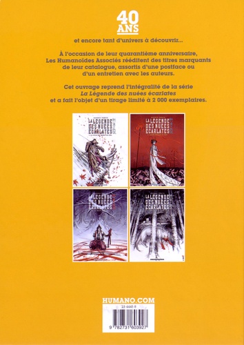 A l'occasion de leur quarantième anniversaire, Les Humanoïdes Associés rééditent des titres marquants de leur catalogue, assortis d'une postface ou d'un entretien avec les auteurs. Cet ouvrage reprend l'intégralité de la série La Légende des nuées écarlates et a fait l'objet d'un tirage limité à 2 000 exemplaires.