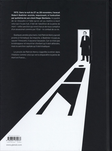 " La justice française ne peut plus être une justice qui tue. " 1972. Dans la nuit du 27 au 28 novembre, l'avocat Robert Badinter assiste, impuissant, au supplice par guillotine de son client Roger Bontems. Incapable de se résoudre à l'idée qu'un homme qui n'a pas tué ait pu être exécuté, il fait de l'abolition de la peine de mort - cette sanction qui rend chacun de nous complice d'un assassinat commis par l'Etat -, le grand combat de sa vie. Quelques années plus tard, c'est Patrick Henry qui est promis à l'échafaud. Qu'importe : si Badinter n'a pas pu sauver l'innocent, il sauvera celui que rien ne pourrait excuser. Car ce n'est pas le kidnappeur et le meurtrier d'enfant qu'il doit défendre, mais la sanction capitale qu'il doit éradiquer. Le procès de Patrick Henry s'apprête à entrer dans l'histoire comme un procès de rupture... Celui qui verra disparaître la peine de mort en France. Héros et héraut du combat pour l'abolition de la peine de mort, Robert Badinter est entré au Panthéon le 9 octobre 2025. Militante pour l'abolition universelle de la peine de mort, la scénariste Marie Bardiaux-Vaïente accompagnée de Malo Kerfriden, retrace le parcours du militant puis du ministre de la Justice du premier septennat de François Mitterrand dont l'engagement aboutit à la loi du 10 octobre 1981. Ce passionnant roman graphique, accompagné d'un cahier historique érudit, revient sur un pan essentiel de l'histoire judiciaire française.