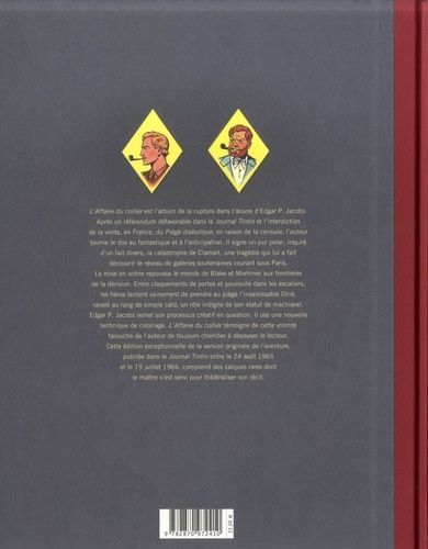 Olrik qui défraye la chronique des faits divers et se transforme tour à tour en passe muraille et en gentleman cambrioleur, voilà qui ne laisse pas d'étonner Blake et Mortimer ! Ces derniers se sont rendus à Paris pour une confrontation avec leur vieil ennemi au Palais de Justice. Mais le colonel, par un magistral tour de passe-passe et l'utilisation d'un complice extérieur, réussit à fausser compagnie à ses geôliers avant d'arriver au Palais. L'histoire ferait presque sourire nos deux Anglais, si le colonel ne les mettait au défi de l'arrêter avant qu'il ne commette quelque forfait. Or les feux de l'actualité sont alors braqués sur une affaire que d'aucun dans l'opinion publique française n'hésite pas à qualifier "d'Etat". Sir Williamson, un richissime collectionneur britannique, se propose de faire cadeau à la reine Elisabeth du collier de Marie-Antoinette, celui-là même qui fut à l'origine d'un retentissant scandale qui, à la fin de l'ancien régime, préluda à la révolution. Le prestigieux bijou doit être présenté à l'issue d'une réception que donne Sir Williamson chez le joaillier Duranton. C'est ce moment que choisit Olrik pour refaire surface et subtiliser le collier, au nez et à la barbe de Blake et Mortimer, eux aussi invités à la fête. Mais quelle curieuse stratégie pousse donc Olrik à informer par téléphone tous les journaux de son forfait ? Pour quelle raison harcèle-t-il le pauvre Duranton, déjà bien éprouvé par la disparition du bijou dans son hôtel particulier ? Pour le savoir, nos deux héros devront mener une enquête dans les rues et les sous-sols de la capitale, parcourant les catacombes, allant de filature en course-poursuite à la recherche du repaire d'Olrik et de ses sbires. Une aventure policière rocambolesque au parfum de mystère qu'on n'appellera désormais plus autrement que "la deuxième affaire du collier" !