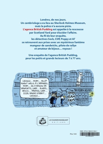 Londres, de nos jours. Un cambriolage a eu lieu au Sherlock Holmes Museum, mais la police n'a aucune piste. L'agence British Pudding est appelée à la rescousse par Scotland Yard pour élucider l'affaire. Au fil de leur enquête, les détectives Sock, Cliff, Poppy et Al' se retrouvent aux prises avec un mystérieux fantôme mangeur de sandwichs, pilote de rallye et amateur de bijoux... royaux ! Une enquête de l'agence British Pudding, pour les petits et grands lecteurs de 7 à 77 ans.
