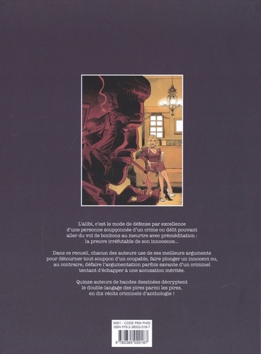 Un alibi est un mode de défense d'une personne soupçonnée d'un crime ou délit, pouvant aller du vol de bonbons au meurtre avec préméditation. Autour de ce thème, 15 auteurs d'exception usent de leurs meilleurs arguments pour détourner tout soupçon d'un coupable, faire plonger un innocent ou au contraire défaire un criminel tentant d'échapper à une accusation méritée. Après le succès du premier recueil de fictions policières Le Crime parfait, les éditions Philéas proposent cette année un nouvel album collectif réunissant à son sommaire un nouveau palmarès de talents ! Un alibi est une réponse ou un mode de défense d'une personne soupçonnée d'un crime ou délit, pouvant aller du vol de bonbons au meurtre avec préméditation. Au XIVe siècle, il signifie " s'être trouvé ailleurs au moment où un crime a été commis " mais ne prendra le sens juridique que nous lui connaissons que des siècles plus tard. Au sens figuré, alibi prend le sens de justification : des agences d'alibi ont fait leur apparition au Japon en 1990 puis en Europe. Ces agences fournissent des justificatifs qui permettent à leur client d'expliquer une absence, qui, le plus souvent, concerne l'adultère... Cette nouvelle anthologie réunit Hugues Labiano, Jimmy Beaulieu, Olivier Berlion, Laurent Galandon et Benoît Blary, Richard Guérineau, Laurent Astier et Xavier Bétaucourt, Séverine Lambour et Benoît Springer, Etienne Le Roux et Vincent Froissard, Jack Manini, Jeanne Puchol, Thierry Robin. Chacun use de ses meilleurs arguments pour tantôt détourner tout soupçon d'un coupable, faire plonger un innocent ou au contraire défaire l'argumentation, parfois savante, d'un criminel tentant d'échapper à une accusation méritée. Les surprises sont nombreuses au fil des récits, soulignés par les textes ciselés d'Anaïs Bon.