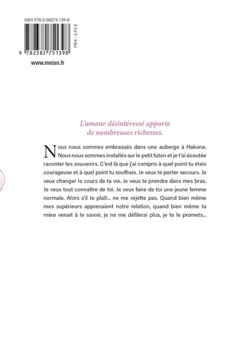L'amour désintéressé apporte de nombreuses richesses. Nous nous sommes embrassés dans une auberge à Hakone. Nous nous sommes installés sur le petit futon et je t'ai écoutée raconter tes souvenirs. C'est là que j'ai compris à quel point tu étais courageuse et à quel point tu souffrais. Je veux te porter secours. Je veux changer le cours de ta vie. Je veux te prendre dans mes bras. Je veux tout connaître de toi. Je veux faire de toi une jeune femme normale. Alors s'il te plaît... ne me rejette pas. Quand bien même mes supérieurs apprenaient notre relation, quand bien même ta mère venait à le savoir, je ne me défilerai plus, je te le promets... " S'il te plaît... Ne me rejette pas. " Je veux te porter secours... Je veux changer le cours de ta vie. Je ne me défilerai plus, je te le promets...