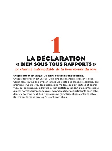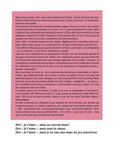 20 déclarations d'amour décalées mais toujours sincères pour célibataires qui essaient de sortir du bois ou pour couples qui vont devoir endurer leur millième anniversaire. Bref, pour toutes celles et ceux qui doivent dire je t'aime". Parce que se déclarer en stand-up, c'est le faire avec la classe. Et puis en cas de râteau, autant laisser un souvenir impérissable".