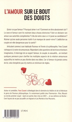 Qu'est-ce que l'amour ? Pourquoi aime-t-on ? Comment en être absolument sûr ? Le sexe et l'amour sont-ils vraiment deux choses distinctes ? Doit-on déclarer son amour aux autorités compétentes ? L'élu de notre coeur a-t-il posé sa candidature ? N'aimer qu'une seule personne trahit-il un manque de savoir-vivre ? L'addiction au couple est-elle dangereuse pour la santé ? Articulant comme à son habitude l'humour et l'ironie à la philosophie, Yves Cusset s'attaque ici à notre vie amoureuse. Répondant à des questions de lectrices et lecteurs imaginaires, il interroge tel un expert l'amour, le couple, la sexualité... en invitant quelques penseurs pour clarifier les multiples aspects de la relation amoureuse aujourd'hui et mettre un peu d'ordre dans nos idées. Car si l'amour n'a jamais connu de loi, cela n'empêche pas d'y mettre un minimum de règles. Auteur et comédien, Yves Cusset a développé dans le domaine du théâtre et de la littérature le genre de l'humour philosophique. Il a notamment publié chez Flammarion : Rire, Réussir sa vie (du premier coup) - repris en poche chez Litos en 2023 -, et aux éditions du Rocher : Cent façons de ne pas accueillir un migrant et Les Mortels et les Mourants.