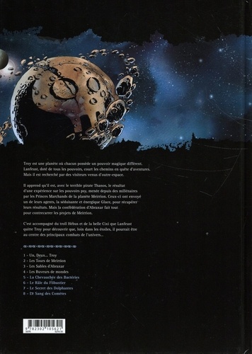 C'est accompagné du troll Hébus et de la belle Cixi que Lanfeust a quitté Troy pour découvrir que, loin dans les étoiles, il pourrait être au centre des principaux combats de l'univers... . . Abraxar, siège de la résistance contre la domination des princes marchands, vient d'être envahie par les hommes de Dheluu. A leur tête, Thanos et l'agent Glace. Mais Lanfeust a tenté une manoeuvre désespérée : faire passer la planète entière à travers une porte pour l'expédier... loin. Ce qu'il n'avait pas prévu, c'était un choc en retour qui les enverrait, lui et Swiip, quatre mille ans dans le passé...