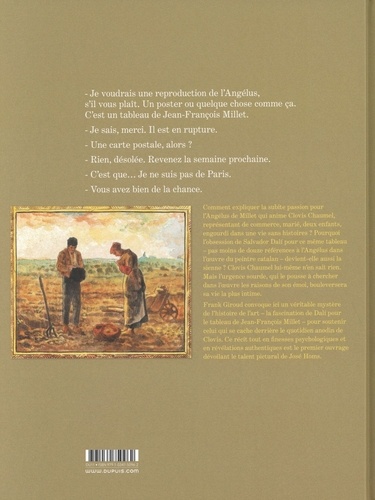 Comment expliquer la subite passion pour l'Angélus de Millet qui anime Clovis Chaumel, représentant de commerce, marié, deux enfants, engourdi dans une vie sans histoires ? Pourquoi l'obsession de Salvador Dalí pour ce même tableau - pas moins de douze références à l'Angélus dans l'oeuvre du peintre catalan - devient-elle aussi la sienne ? Clovis Chaumel lui-même n'en sait rien. Mais l'urgence sourde, qui le pousse à chercher dans l'oeuvre les raisons de son émoi, bouleversera sa vie la plus intime. Frank Giroud convoque ici un véritable mystère de l'histoire de l'art - la fascination de Dalí pour le tableau de Jean-François Millet - pour soutenir celui qui se cache derrière le quotidien anodin de Clovis. Ce récit tout en finesses psychologiques et en révélations authentiques est le premier ouvrage dévoilant le talent pictural de José Homs.