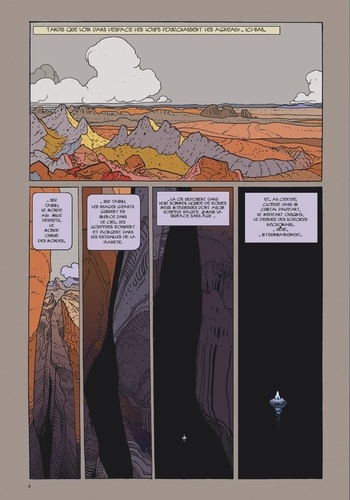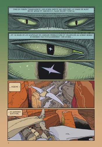 Qui est Arzak ? Que cherche t-il ? D’ou vient t-il ? L’album de 1977 ne le dit pas...On ne connaît de lui que son visage brûlé par les vents du désert, sa grande cape et son chapeau en forme de cône. On sait qu’il chevauche un curieux volatile d’un blanc éclatant. Ensemble ils survolent un univers de fin du monde, aux perspectives désolées et stériles. Ils y croisent les lambeaux d’une civilisation engloutie. Ils traversent des situations absurdes, aux prises avec une faune et une flore tour à tour cocasses, inquiétantes et mortelles. Mœbius répond aujourd’hui à l’appel muet de ce mystérieux héros. Il lui redonne la parole, l’humanise. Le plonge dans des aventures qui révèlent au lecteur l’origine des secrets du monde dans lequel il évolue. L’Arpenteur est le premier tome d’une aventure qui en comportera trois. L’histoire s’ouvre sur deux actions apparemment sans aucun lien entre elles. La première nous emmène dans l’espace profond où un vaisseau de la confédération Dessmez est attaqué par Kimorg Barbax, le redoutable pirate. La deuxième se déroule sur Tassili, la planète d’origine des Wergs. L’ancienne race dominante a été vaincue par l’avancée irrésistible de la confédération Dessmez dans sa conquête humaine de la galaxie. Tassili, ruinée, désertique et abandonnée de tous, peuplée d’une maigre colonie humaine, se meurt doucement. La mission d’Arzak consiste à arpenter sans fin ce territoire chaotique pour y traquer l’anomalie et assurer l’ordre humain. C’est dans l’accomplissement de cette mission qu’il découvre un odieux trafic perpétré à l’encontre des survivants Wergs. Arzak entame son enquête ; il traversera épreuves et dangers, découvrira les secrets de Tassili et plongera dans les abîmes des passions de l’âme humaine…Le monde d’Arzak est maintenant un livre ouvert et Arzak en est le héros. Le mythique Arzak a laissé une empreinte inoubliable dans l’univers de la bande dessinée et continue trente ans après, à être lu dans le monde entier. Ce nouvel album d’Arzak est une coproduction des éditions Mœbius Productions et Glénat.