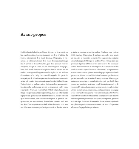 En décembre 1946, Maurice de Bevere, dit "Morris" , publie, dans L'Almanach Spirou, la première aventure de Lucky Luke : Arizona 1880. Le succès populaire est tel que le créateur s'efface très vite devant sa création. Question de modestie sans doute. Et pourtant... Morris est un pur génie du 9e art : il invente une narration de l'action, avec un sens unique de la mise en scène. Son esthétique confine à l'exceptionnel. Il était grand temps de lui consacrer une (très belle) exposition, et un beau livre.