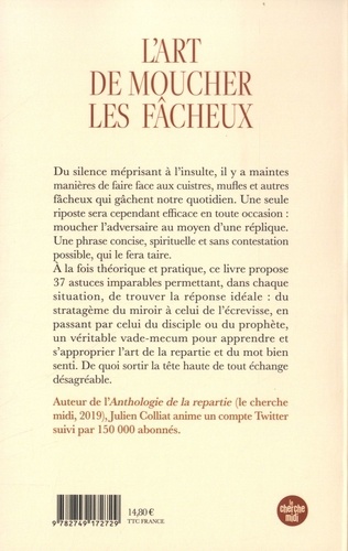 Après son Anthologie de la repartie , Julien Colliat livre 37 stratagèmes pour mater importuns et autres raseurs. Une oeuvre de salubrité publique. Du silence méprisant à l'insulte, il y a maintes manières de faire face aux cuistres, mufles et autres fâcheux qui gâchent notre quotidien. Une seule riposte sera cependant efficace en toute occasion : moucher l'adversaire au moyen d'une réplique. Une phrase concise, spirituelle et sans contestation possible, qui le fera taire. A la fois théorique et pratique, ce livre propose 37 astuces imparables permettant, dans chaque situation, de trouver la réponse idéale : du stratagème du miroir à celui de l'écrevisse, en passant par celui du disciple ou du prophète, un véritable vade-mecum pour apprendre et s'approprier l'art de la repartie et du mot bien senti. De quoi sortir la tête haute de tout échange désagréable.