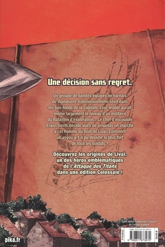 Un groupe de bandits équipés de harnais de manoeuvre tridimensionnelle sévit dans les bas-fonds de la capitale. Leur leader aurait même largement le niveau d'un militaire du Bataillon d'exploration... Le chef d'escouade Erwin Smith décide alors de proposer un marché à cet homme du nom de Livaï. Comment un voyou a-t-il pu devenir le plus fort de tous les soldats ? Découvrez les origines de Livaï, un des héros emblématiques de l'Attaque des Titans dans une édition Colossale !