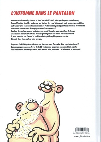 Touche pas à ma libido ! Comme tout le monde, Conrad et Paul ont vieilli. Mais pire que la perte des cheveux, la prolifération de rides ou la vue qui baisse, les voici désormais confrontés à un problème autrement plus sérieux : la diminution de testostérone provoquant des troubles de la libido, autrement connue sous le tragique nom d'andropause ! Conrad en devient carrément malade : qui aurait imaginé que les affres du temps viendraient porter atteinte au dernier grand plaisir sur Terre ? Heureusement, il peut compter sur Paul et sa légendaire philosophie pour en parler. Bientôt, il ne leur restera plus que ça... Le grand Ralf König réussit le tour de force de nous faire rire d'un sujet aussi déprimant ! Comme ses personnages, le roi de la BD teutonne a gagné en sagesse et fait montre dans ce nouvel ouvrage d'un humour davantage amer mais encore plus percutant... L'album de la maturité ?