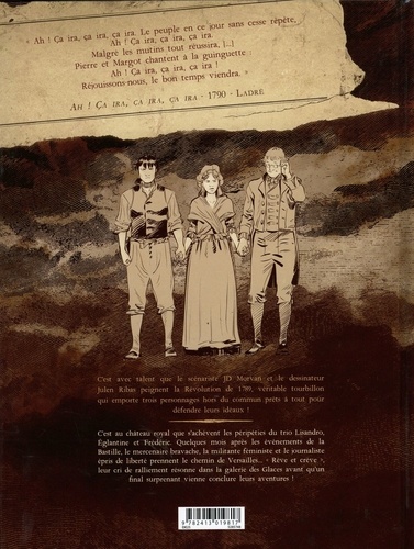 C'est au château royal que s'achèvent les péripéties du trio Lisandro, Eglantine, et Frédéric. Quelques mois après la Bastille, le mercenaire bravache, la militante féministe et le journaliste épris de liberté prennent le chemin de Versailles... "Rêve et crève" , leur cri de ralliement résonne dans la galerie des Glaces avant qu'un final surprenant vienne conclure (ou relancer ? ) leur aventure !