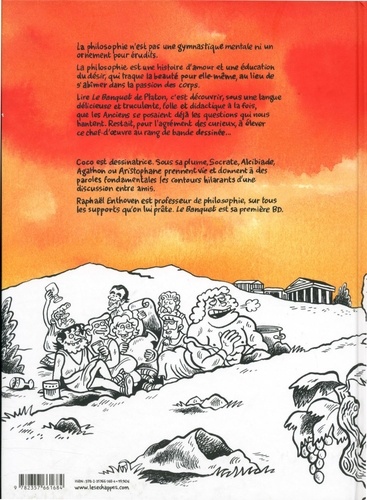 La philosophie n'est pas une gymnastique mentale ni un ornement pour érudits. La philosophie, est une histoire d'amour et une éducation du désir, qui traque la beauté pour elle même, au lieu de s'abîmer dans la passion des corps. Lire Le Banquet de Platon, c'est découvrir, sous une langue délicieuse et truculente, folle et didactique a la fois, que les Anciens se posaient déjà les questions qui nous hantent. Restait, pour l'agrément des curieux, à élever ce chef-d'oeuvre au rang de bande dessinée...