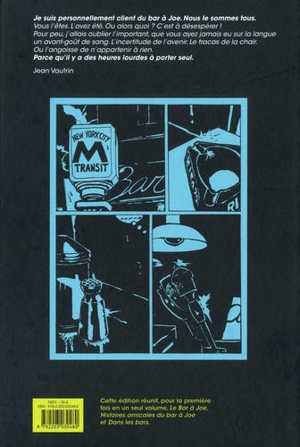 Je suis personnellement client du bar à Joe. Nous le sommes tous. Vous l'êtes. L'avez été. Ou alors quoi ? C'est à désespérer ! Pour peu, j'allais oublier l'important, que vous ayez jamais eu sur la langue un avant-goût de sang. L'incertitude de l'avenir. Le tracas de la chair. Ou l'angoisse de n'appartenir à rien. Parce qu'il y a des heures lourdes à porter seul. Jean Vautrin