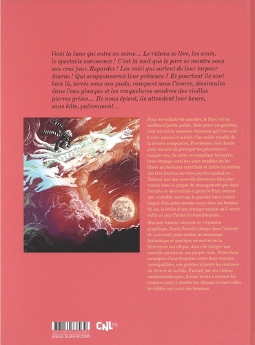 Pour les enfants du quartier, le parc est un inoffensif jardin public. Mais pour son gardien, c'est un nid de sombres créatures qu'il est le seul à voir : asocial et atteint d'un solide trouble de la rêverie compulsive, Providence s'est donné pour mission de protéger les promeneurs malgré eux. Sa tâche se complique lorsqu'un livre étrange sorti des eaux troubles du lac libère un bestiaire terrifiant et attire l'attention des très louches services psycho-sanitaires... Talonné par une nouvelle directrice bien plus versée dans le jargon du management que dans l'occulte et déterminée à gérer le parc comme une véritable start-up, le gardien lutte contre l'appel d'un autre monde : noyé dans les brumes du lac, le reflet d'une étrange maison où il serait enfin en paix l'attire irrésistiblement... Mariant humour absurde et virtuosité graphique, Daria Schmitt plonge dans l'univers de Lovecraft pour rendre un hommage fantastique et poétique au maître de la littérature horrifique, dont elle intègre une nouvelle au sein de son propre récit. Protecteur incompris d'une frontière entre deux mondes incompatibles, son gardien arpente les contrées du rêve et de la folie. Fasciné par ses visions cauchemardesques, il nous invite à scruter les ténèbres pour y déceler les démons et merveilles invisibles aux yeux des hommes.