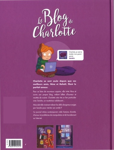 Charlotte se sent seule depuis que ses meilleurs amis, Nina et Rafael, filent le parfait amour. Pour se faire de nouveaux copains, elle imite Nina et ouvre son propre blog, mêlant billets d'humeur et recettes de cuisine. Charlotte crée vite un lien particulier avec Sandro, un mystérieux adolescent... Mais doit-elle vraiment relever les défis dangereux exigés par Sandro pour mériter son amitié ? Ce journal intime contemporain mêle histoires d'amitié, d'amour et problèmes de manipulation et de harcèlement sur Internet.