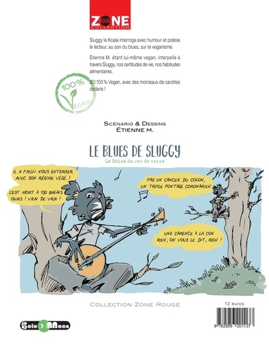 Sluggy le Koala interroge avec humour et poésie le lecteur, au son du blues, sur le veganisme. Etienne M. étant lui-même vegan, interpelle à travers Sluggy, nos certitudes de vie, nos habitudes alimentaires. BD 100 % Vegan, avec des morceaux de carottes dedans !