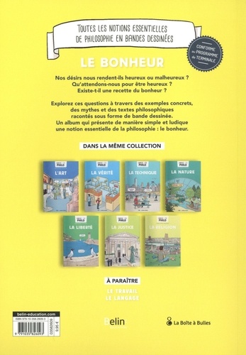 Qu'attendons-nous pour être heureux ? Une vie heureuse est-elle une vie de plaisir ? Le désir rend-il malheureux ? Explorez ces questions à travers des exemples concrets, des mythes et des textes philosophiques racontés sous forme de bande dessinée. Un album qui présente de manière simple et ludique une notion essentielle de la philosophie : le bonheur. Rassemblant pour la première fois un éditeur de bande dessinée (La Boîte à Bulles) et un éditeur scolaire (Belin Education), la collection "Toute la philo en BD" s'adresse aux lycéens, aux enseignants, mais aussi au grand public.