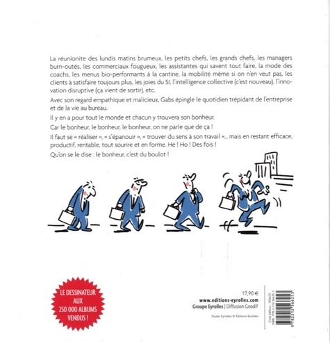 La réunionite des lundis matins brumeux, les petits chefs, les grands chefs, les managers burn-outés, les commerciaux fougueux, les assistantes qui savent tout faire, la mode des coachs, les menus bio-performants à la cantine, la mobilité même si on n'en veut pas, les clients à satisfaire toujours plus, les joies du SI, l'intelligence collective (c'est nouveau), l'innovation disruptive (ça vient de sortir), etc. Avec son regard empathique et malicieux, Gabs épingle le quotidien trépidant de l'entreprise et de la vie au bureau. Il y en a pour tout le monde et chacun y trouvera son bonheur. Car le bonheur, le bonheur, le bonheur, on ne parle que de ça ! Il faut se "réaliser", "s'épanouir", "trouver du sens à son travail"... mais en restant efficace, productif, rentable, tout sourire et en forme. Hé ! Ho ! Des fois ! Qu'on se le dise : le bonheur, c'est du boulot !