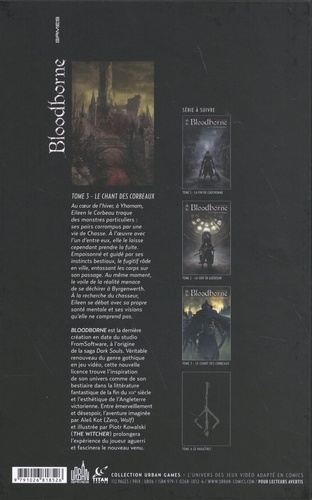 Au coeur de l'hiver, à Yharnam. Eileen le Corbeau traque une espèce de monstres bien particuliers : ses pairs corrompus par une vie de Chasse. A l'oeuvre avec l'un d'entre eux, elle le laisse cependant prendre la fuite. Empoisonné et guidé par ses instincts bestiaux, le fugitif rôde en ville, entassant les corps sur son passage. Au même moment, le voile de la réalité menace de se déchirer à Byrgenwerth. A la recherche du chasseur, Eileen se débat avec sa propre santé mentale et ces visions qu'elle ne comprend pas. Le sang et la mort envahissent Yharnam et ceux qui la suivent... Bloodborne est la dernière création en date du studio FromSoftware, à l'origine de la saga Dark Souls. Véritable renouveau du genre gothique en jeu vidéo, cette nouvelle licence trouve l'inspiration de son univers comme de son bestiaire dans la littérature fantastique de la fin du XIXe siècle et l'esthétique de l'Angleterre victorienne. Entre émerveillement et désespoir, l'aventure imaginée par Ales Kot (Zero, Wolf) et illustrée par Piotr Kowalski (The Witcher) prolongera l'expérience du joueur aguerri et fascinera le nouveau venu.