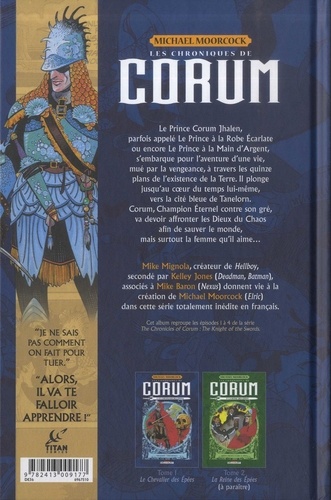 Après Le Cycle des épées de Fritz Leiber voici Corum de Michael Moorcock, le "père" d'Elric, une autre oeuvre de jeunesse de Mike Mignola cette fois en collaboration avec Mike Baron (Nexus, Punisher). Le Prince Corum Jhaelen Irsei, surnommé le Prince à la robe écarlate, nous entraîne dans un voyage épique et fantastique à travers les quinze plans d'existence de la Terre, au coeur même du temps. Héros malgré lui, il est l'une des nombreuses incarnations du "Champion éternel" et doit affronter les terribles Dieux du Chaos afin de sauver le monde, mais aussi la femme qu'il aime.